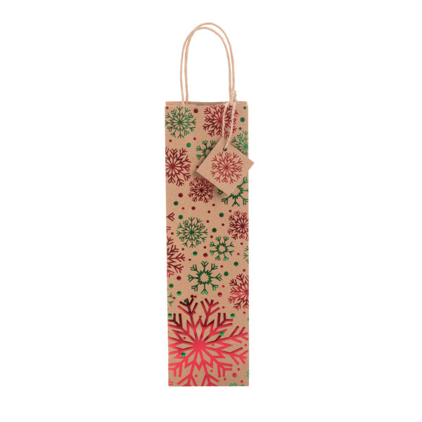 Gerecycled kraftpapier cadeautasje voor wijnfles met foliegestempeld kerstmotief, draaihandvaten en cadeaulabel. 140 g/m².