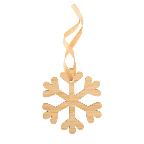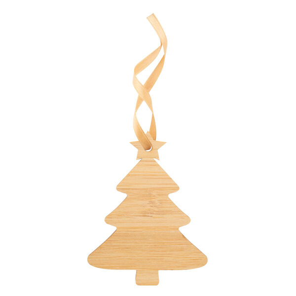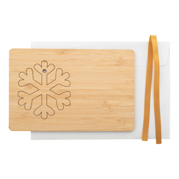 Kerstkaart van bamboe multiplex met break-out kerstboom ornament met gouden lint. Inclusief C6 brievenbusenvelop. Geleverd met los lint.