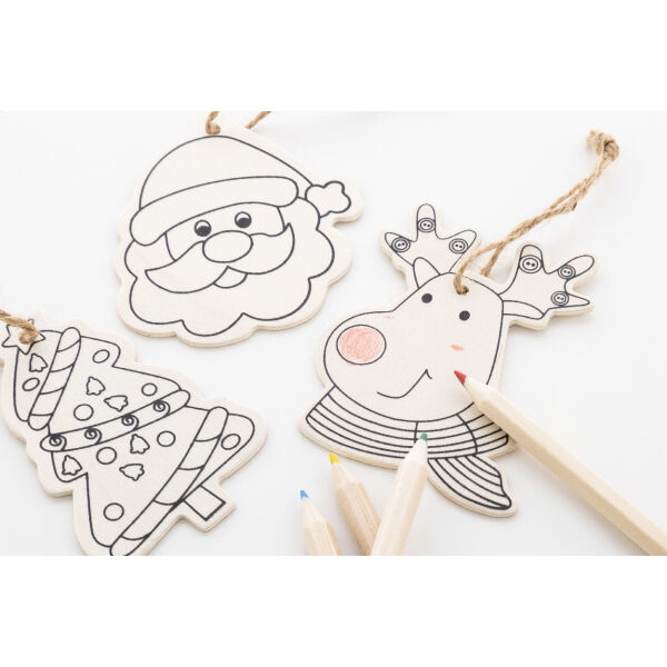 Kleurrijk kerstboomornament in kraftpapierdoos met gestanste kerstboom. Inclusief 3 houten ornamenten met hennepkoord en 4 gekleurde potloden.
