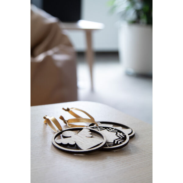 Houten kerstboom versiering van beukenhout. Met gouden lint, los geleverd.