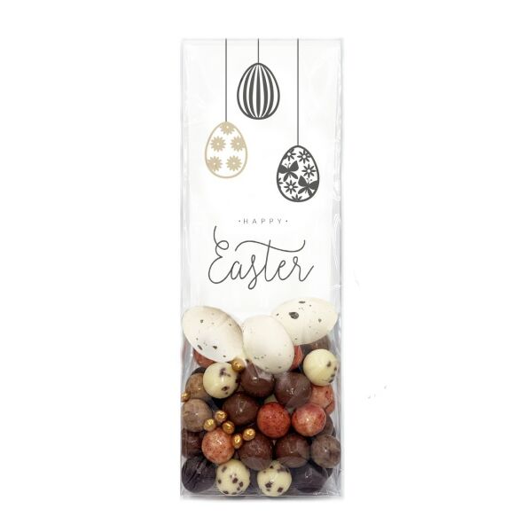 Een mix van verschillende soorten chocolade eitjes in een blokzakje.
