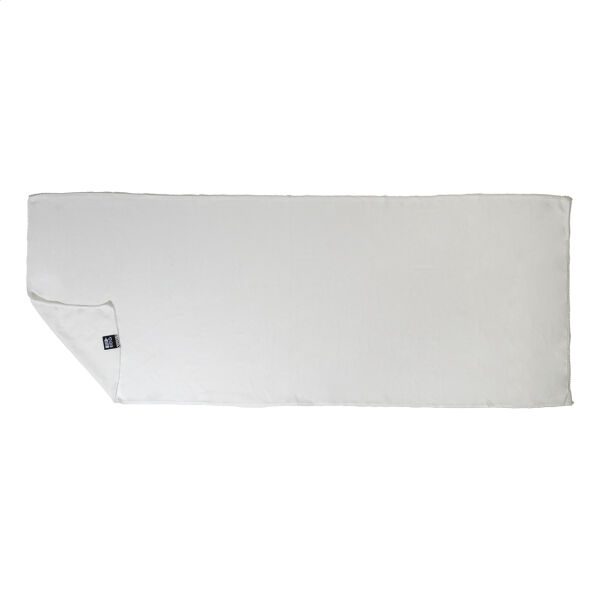 RPET microvezel sporthanddoek in RPET non-woven draagtas met onderscheidend RPET-label. RPET-polyester, 140 g/m².