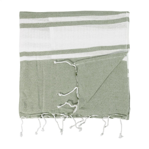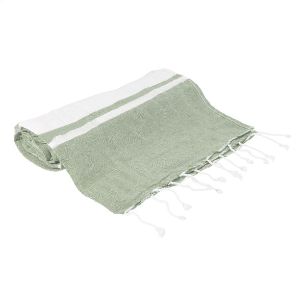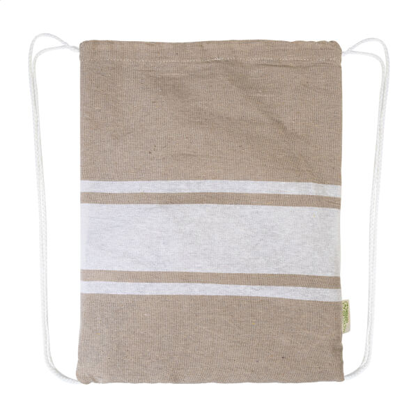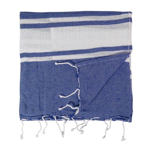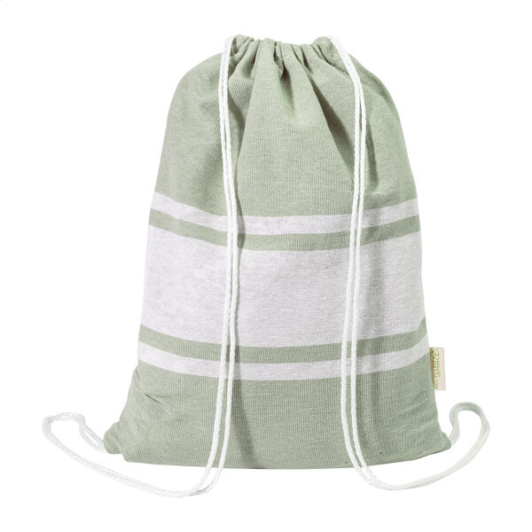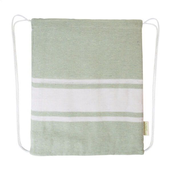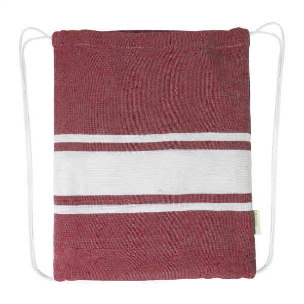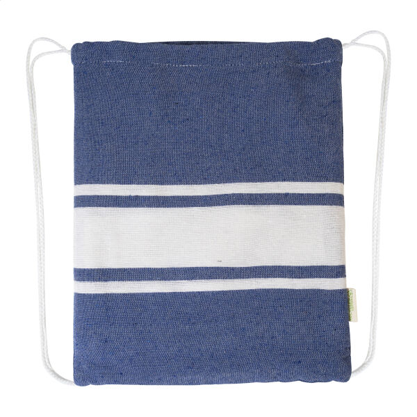 Tweekleurige pareo strandlaken met geïntegreerde trekkoordzak.70% gerecycled katoen en 30% RPET polyester, 180 g/m².